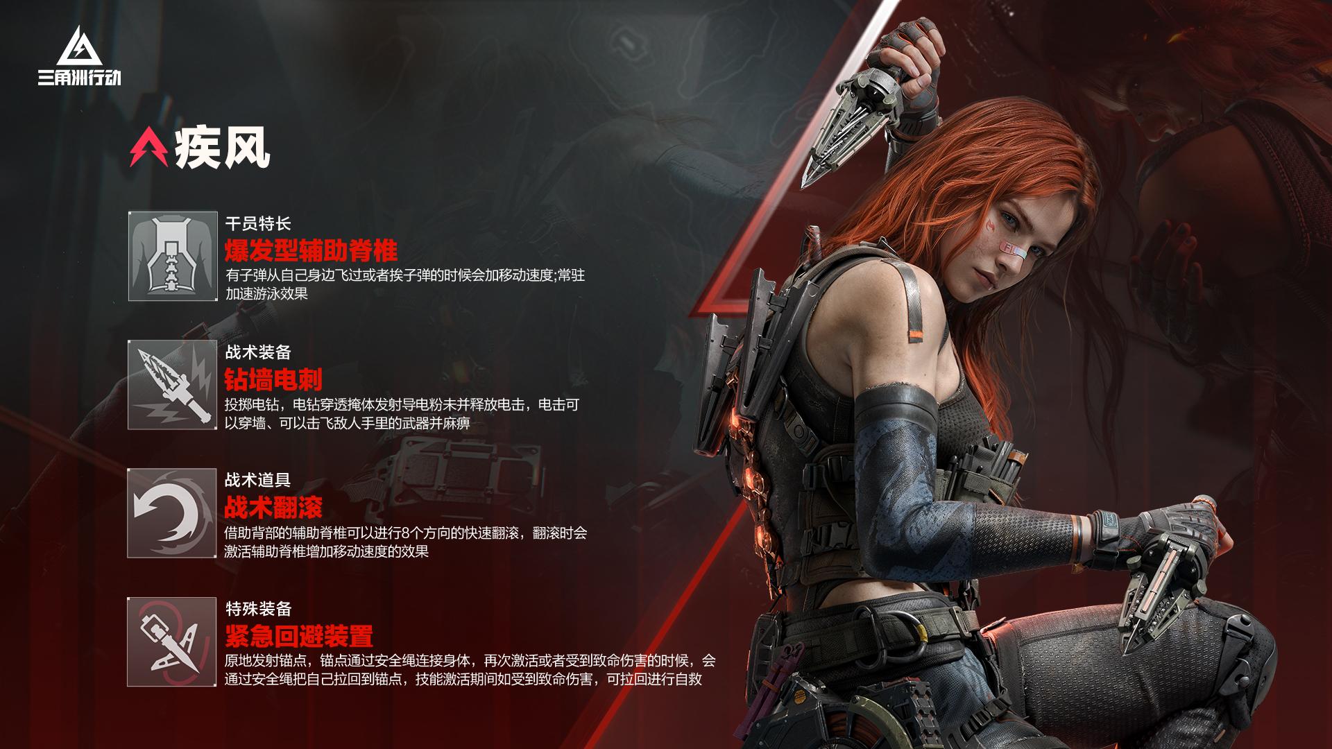 疾风,姓名克莱尔·安·拜尔斯,拥有卓越的机动性与战场生存能力,并擅长使用特种战术装备。她可以使用钻墙电钻缴械掩体后的敌人,发起突袭。同时也可以在陷入交战时进行八个方向的翻滚,迅速脱离战场或者开辟新的作战空间。另外疾风还可以在原地布置锚点,并主动将自己拉回锚点。在疾风受到致命伤害时,也会自动被拉回锚点进行自救,其在交战时的高机动性,让敌人难以捕捉。