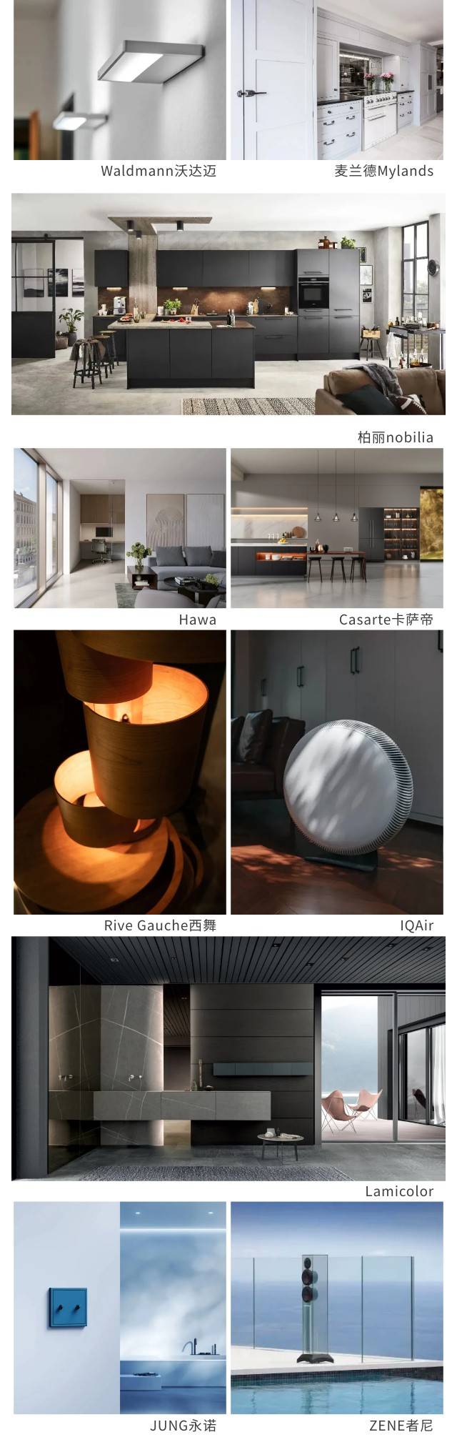 国内外知名品牌以设计思维整合尖端科技,将人文关怀蕴藏于家庭成员生活全场景。德国照明解决方案Waldmann沃达迈、德国著名的开关及智能家居系统制造商JUNG永诺、德国橱柜及全屋定制家居品牌柏丽nobilia、意大利高端厨电品牌BERTAZZONI博塔桑尼、瑞士尖端移门系统Hawa、提供空气净化解决方案的瑞士IQAir、日本高端室内空气定制专家东洋桑TOYOSAN、引进数智化厂区支持全屋定制的Rive Gauche西舞、中国影音娱乐及全宅智能定制安装行业的知名品牌者尼智能影音ZENE、英国最古老的油漆和抛光剂制造商麦兰德Mylands、意大利层压板行业最前沿的标杆公司Lamicolor将于细节之处缔造豪宅典范。从美居到美食,Casarte卡萨帝冰箱以原创科技为用户带来空间艺术和极致保鲜的高端体验。HAI恒家安别墅AI智慧管家,用人工智能重新定义高端墅居安全。