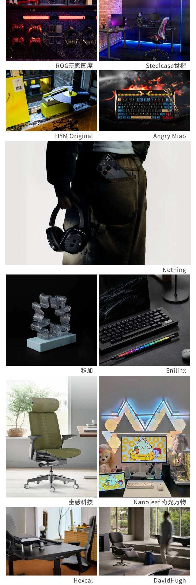 本届“设计深圳”汇聚硬核性能电竞装备ROG玩家国度、原创科技品牌Hexcal、全球化科技品牌Enilinx、沉浸式娱乐设备XEO、模块化智能照明Nanoleaf 奇光万物、一体式黑胶唱片机HYM Original以及结合潮流亚文化的Angry Miao旗下DRY STUDIO等品牌,从视听和体感上带来极致体验。华硕灵耀独家推出高科技陶瓷铝合金工艺,探索科技与艺术的和谐共生。设计驱动型科技品牌Nothing将携Phone系列等大热潮流单品来到现场。融合数字设计、3D打印与可持续材料应用的创新品牌的积加,以3D打印工艺为主要载体的艺术家居和装置艺术创作的StudioLUNA也将展示3D打印技术的最新应用。打造阿基米德航天护脊椅的坐感科技、来自英国剑桥的健康科技创新品牌DavidHugh、探索更加符合人体工学办公姿势的LiberNovo清闲、明星产品人体工学椅享誉海内外的Steelcase世楷等将融智能科技与实用家居设计为一体,打造极致的坐感体验。