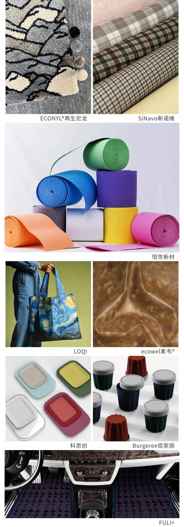 材料先行的概念被越来越多设计师接纳,CMF的应用随之更受关注,也成为产品研发的关键一环。随着汽车产量和销量的增加,CMF于汽车内饰面料的应用也更为广阔与深入。本届“设计深圳”,致力于豪车座舱美学的FULI+、Aquafil旗下意大利创新材料ECONYL®再生尼龙、环保绿色的新型硅皮革SiNavo新诺维、3D光学有机硅皮革融合开创者铂利森、日本的工业涂料品牌武藏涂料、全球领先的高品质聚合物及其组分的生产商之一科思创等将为汽车品牌带来更多材料灵感与质感。PET声学材料行业引领者Burgeree佰家丽、可再生植物基材料ecowel素韦®、专注于纤维素木浆海绵布研究与应用的恒世新材等品牌,共同推动新材料、新工艺的开发应用。德国柏林LOQI以可持续发展的方式与世界各地的艺术家、博物馆合作,此次将带来Moomin合作系列。