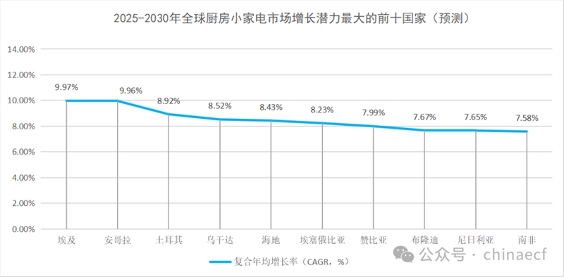 从全球厨房小家电市场来看,非洲地区是一片颇具增长潜力的蓝海市场,企业可重点布局埃及、安哥拉、埃塞俄比亚、赞比亚、南非等国家市场,通过与当地线下商超、经销商合作铺开销售渠道,并凭借高性价比厨房小家电产品,快速抢占蓝海市场。同时,积极布局本土化生产、完善搭建本地化销售网络,为进一步打开市场奠定基础。